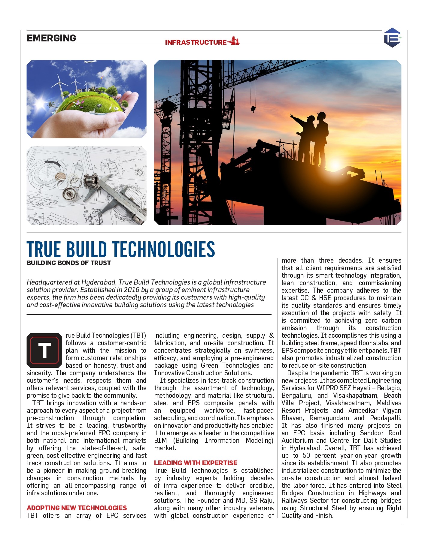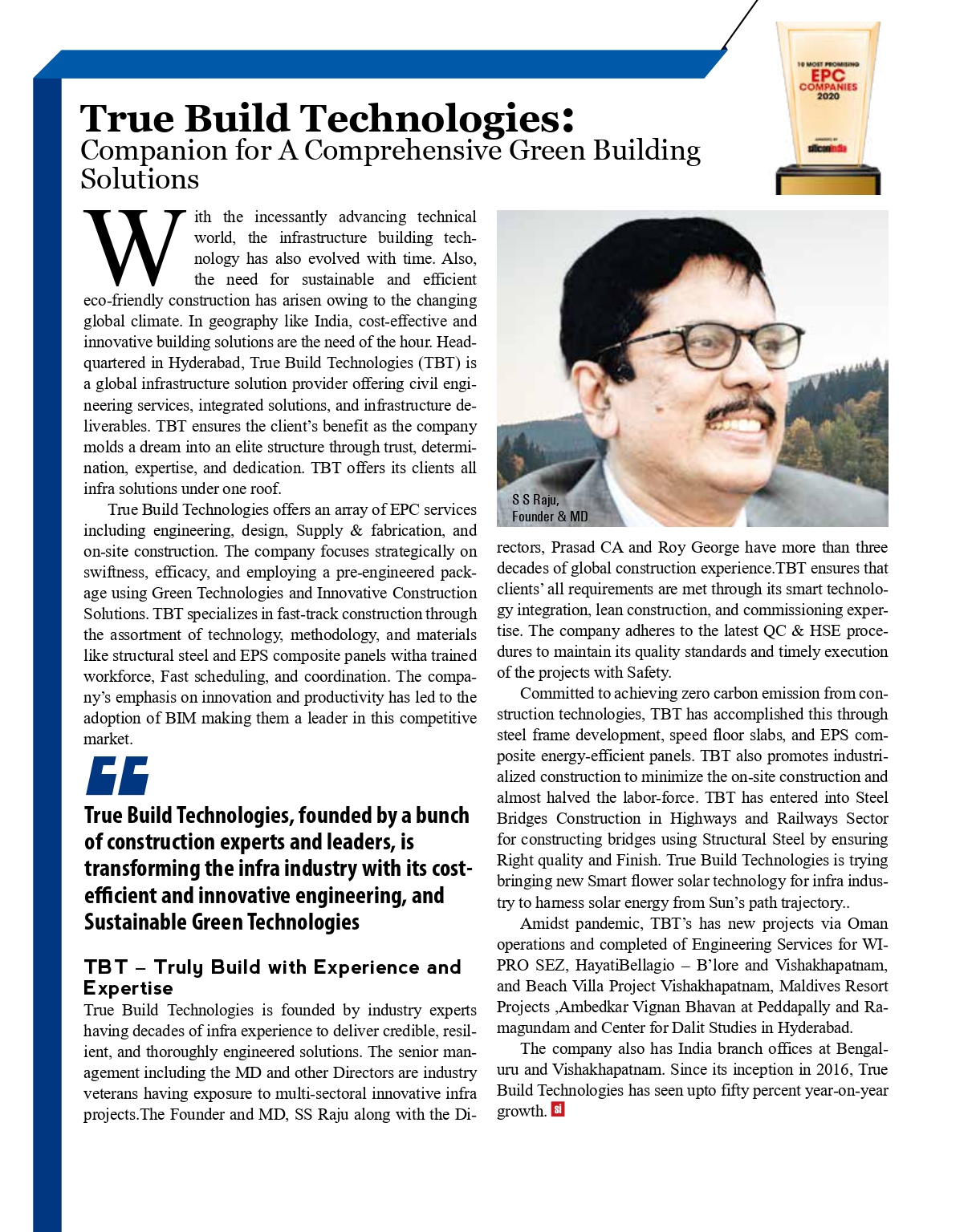 “Founded by an Infrastructure expert and visionary leader from the construction industry with an ambition to create the company of 21st century, True Build Technologies, to provide high quality and cost effective innovative building solutions with State of Art Technologies.”